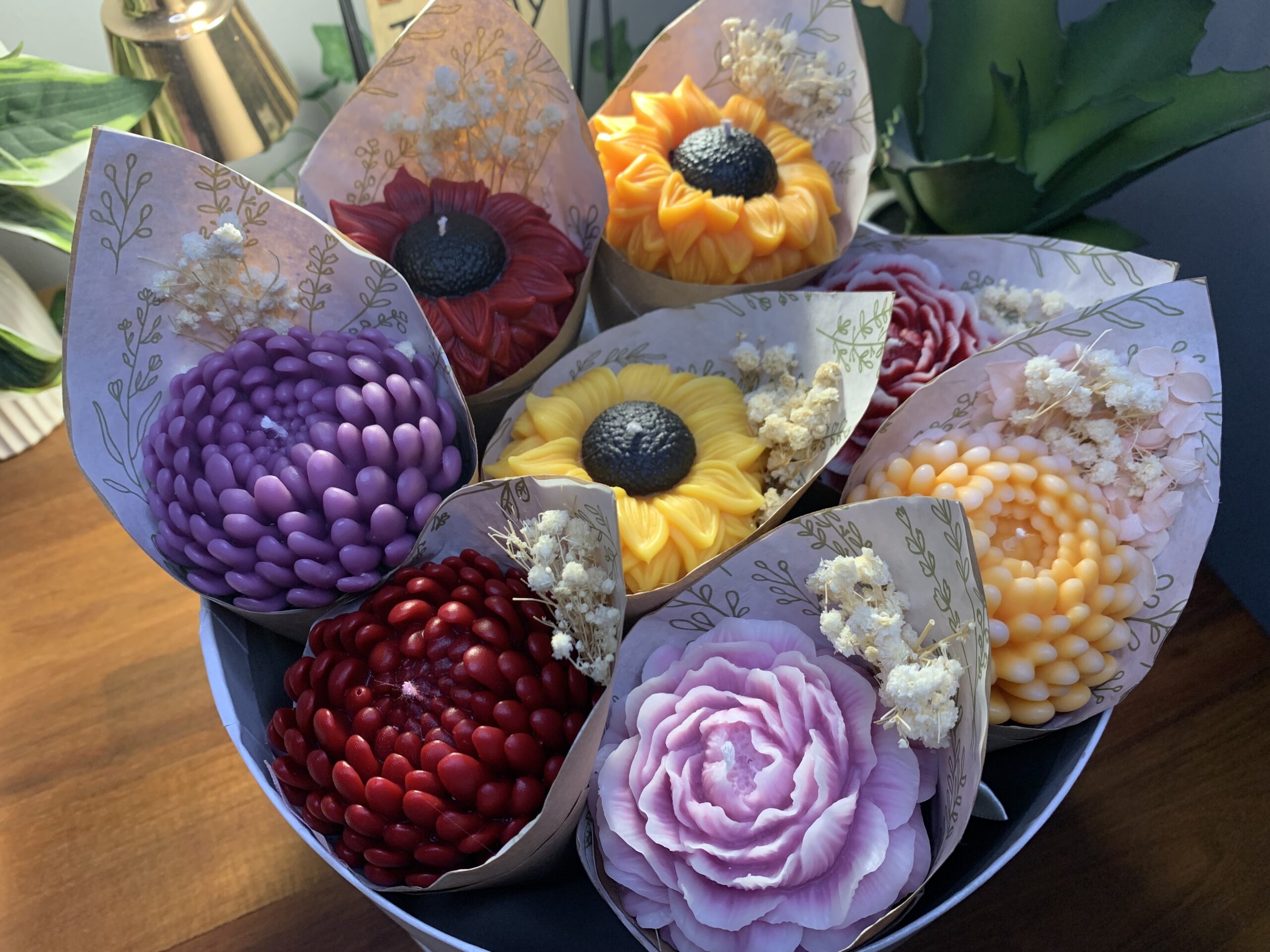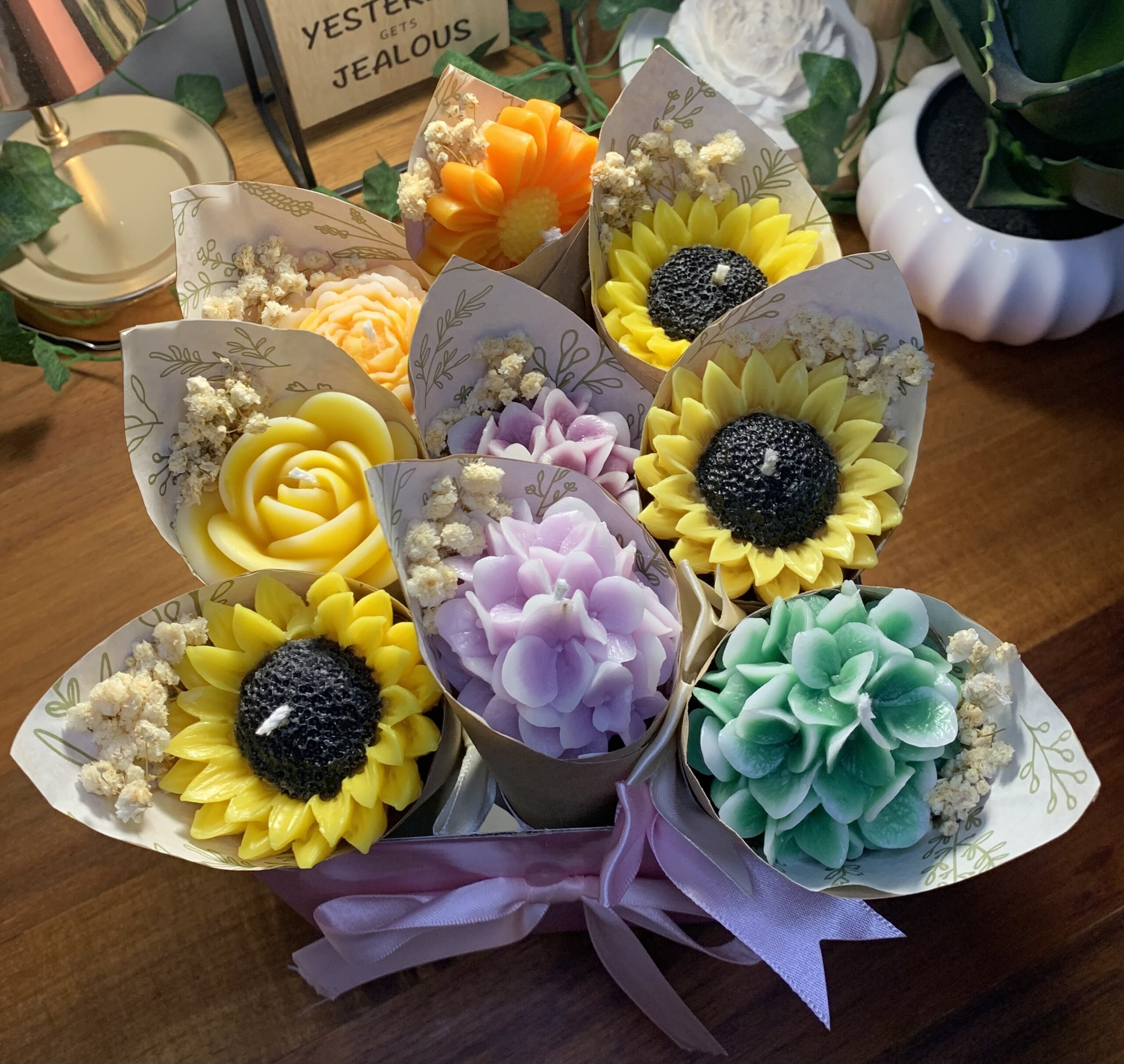 This candle flower bouquet’s is a charming blend of art and ambiance; each candle is carefully sculpted into detailed floral shapes. Bursting with soft pastels and rich, vibrant hues. Wrapped delicately like a real bouquet.