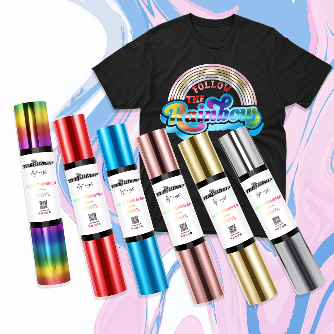 Our ready-to-cut Metallic Heat Transfer Vinyl comes in an exciting bundle of 6 colorful rolls. Its glossy, metallic surface looks like professional paint work. Use this htv vinyl to cut flashy designs, patterns, and graphics for your art and apparel projects.