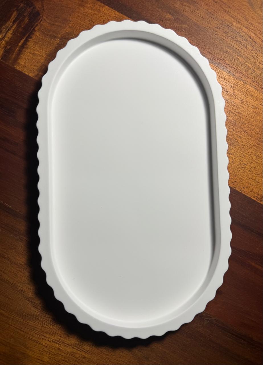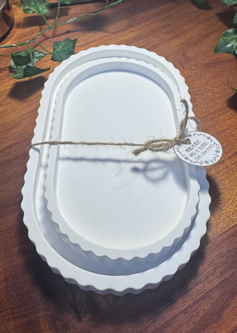 A Charming set of White, striped, Scalloped-edge Trays, perfect for displaying Decor, serving small items or adding a soft, elegant touch to any space.