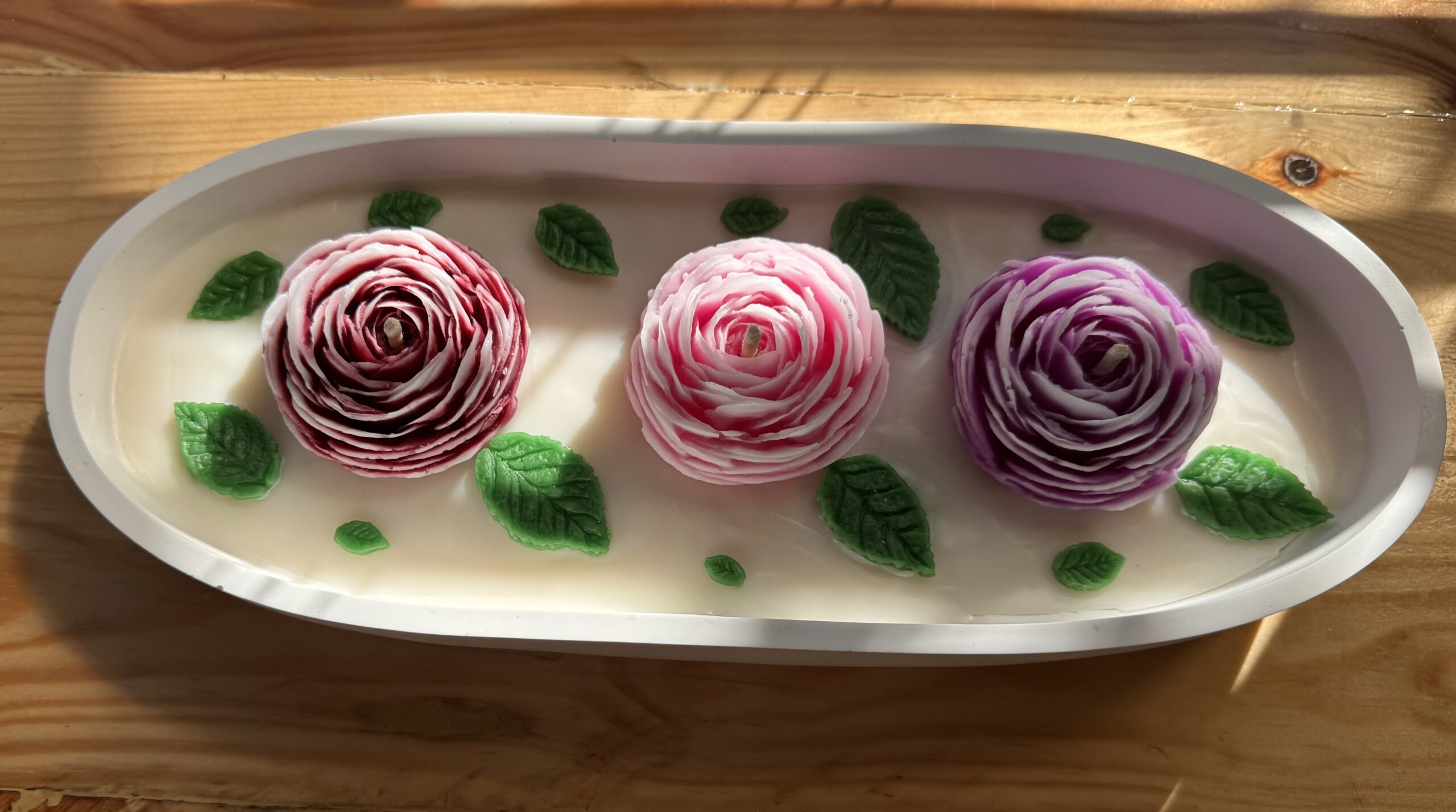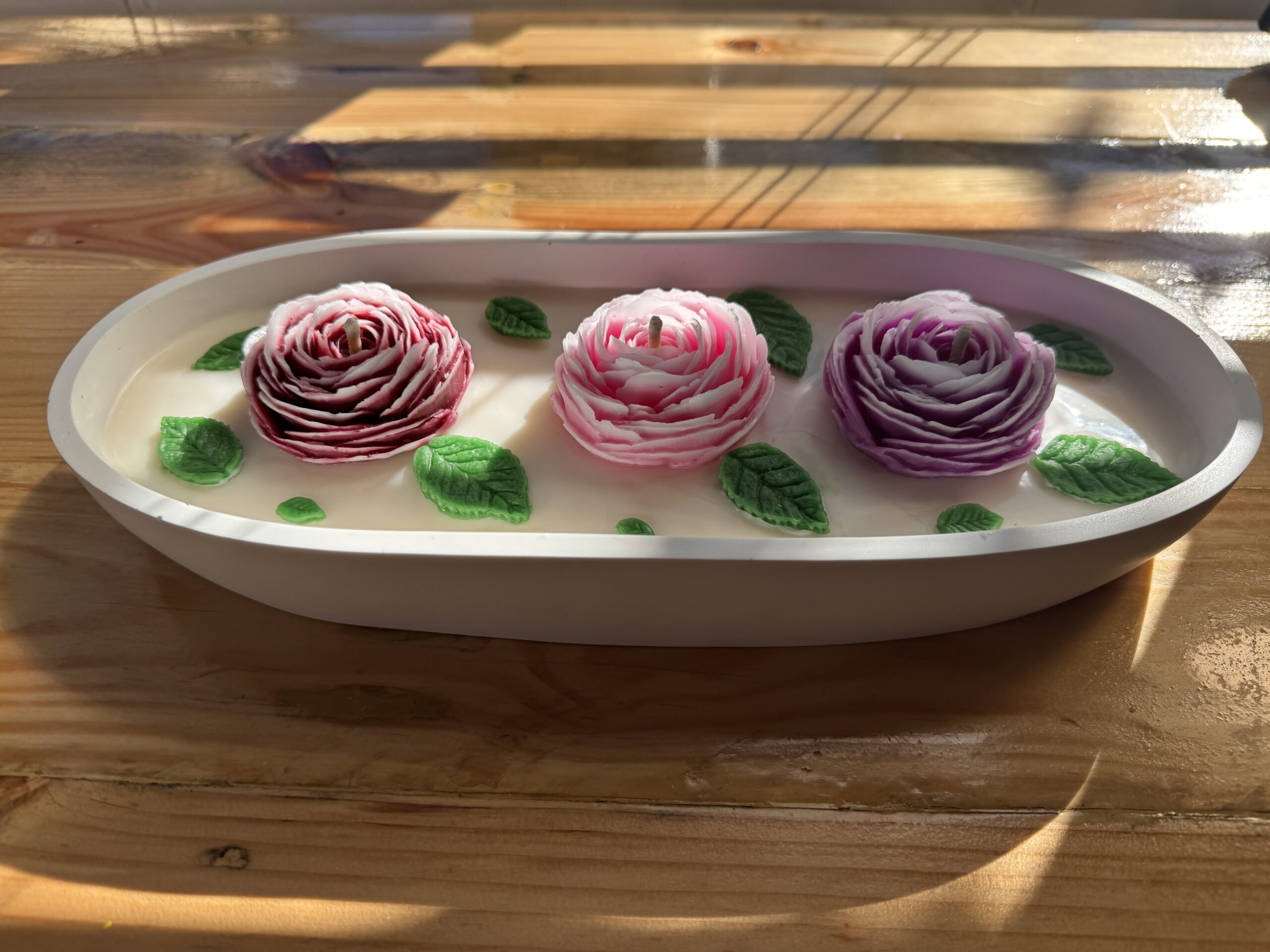 Capture the timeless beauty of a blooming garden with our Ranunculus candle. Hand-poured and lovingly detailed, this candle features three delicate Ranunculus-style flowers in shades of wine red, blush pink, and lavender, surrounded by sculpted green leaves. Crafted from eco-friendly wax, it’s more than just a candle—it’s a work of art. Whether you’re gifting it or placing it as a centrepiece, Eternal Blooms radiates charm, love, and everlasting elegance.